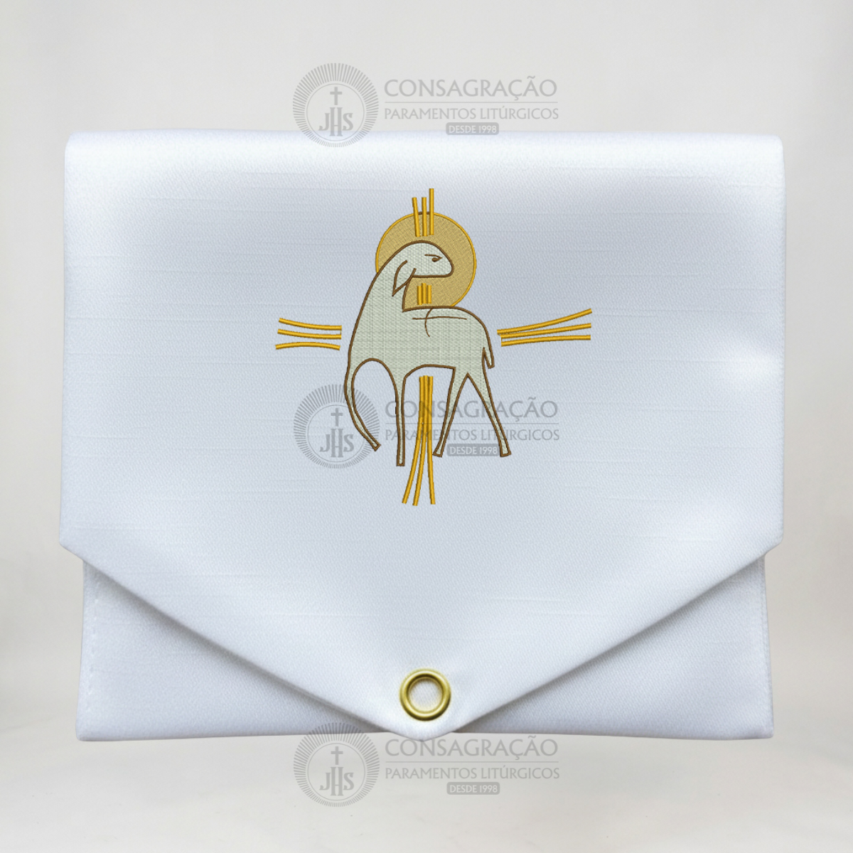 As bolsas viático da Consagração acompanham um corporal e um sanguíneo pequeno, ambos bordados. As texturas do tecido da bolsa podem variar de acordo com a disponiblidade em estoque.