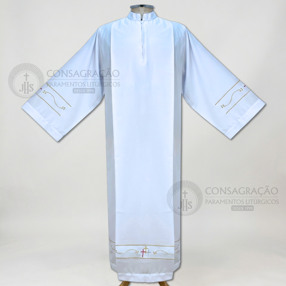 O tecido de excelente qualidade, não amassa com facilidade, torna a peça leve, com toque suave, boa respirabilidade e excelente caimento, adequado ao uso prolongado, mantendo sobriedade e elegância nas celebrações. O modelo conta com bordado cruz e arabescos, valorizando o simbolismo da veste.