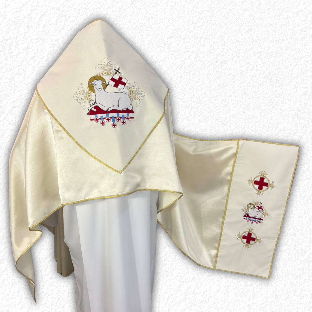 Peça confeccionada em tecido Shantung Importado, com toque acetinado e excelente caimento, possui as faixas laterais e o capuz em tecido rustico, inteiramente bordadas, o acabamento externo no Véu Umeral é feito em fita lourex dourada.